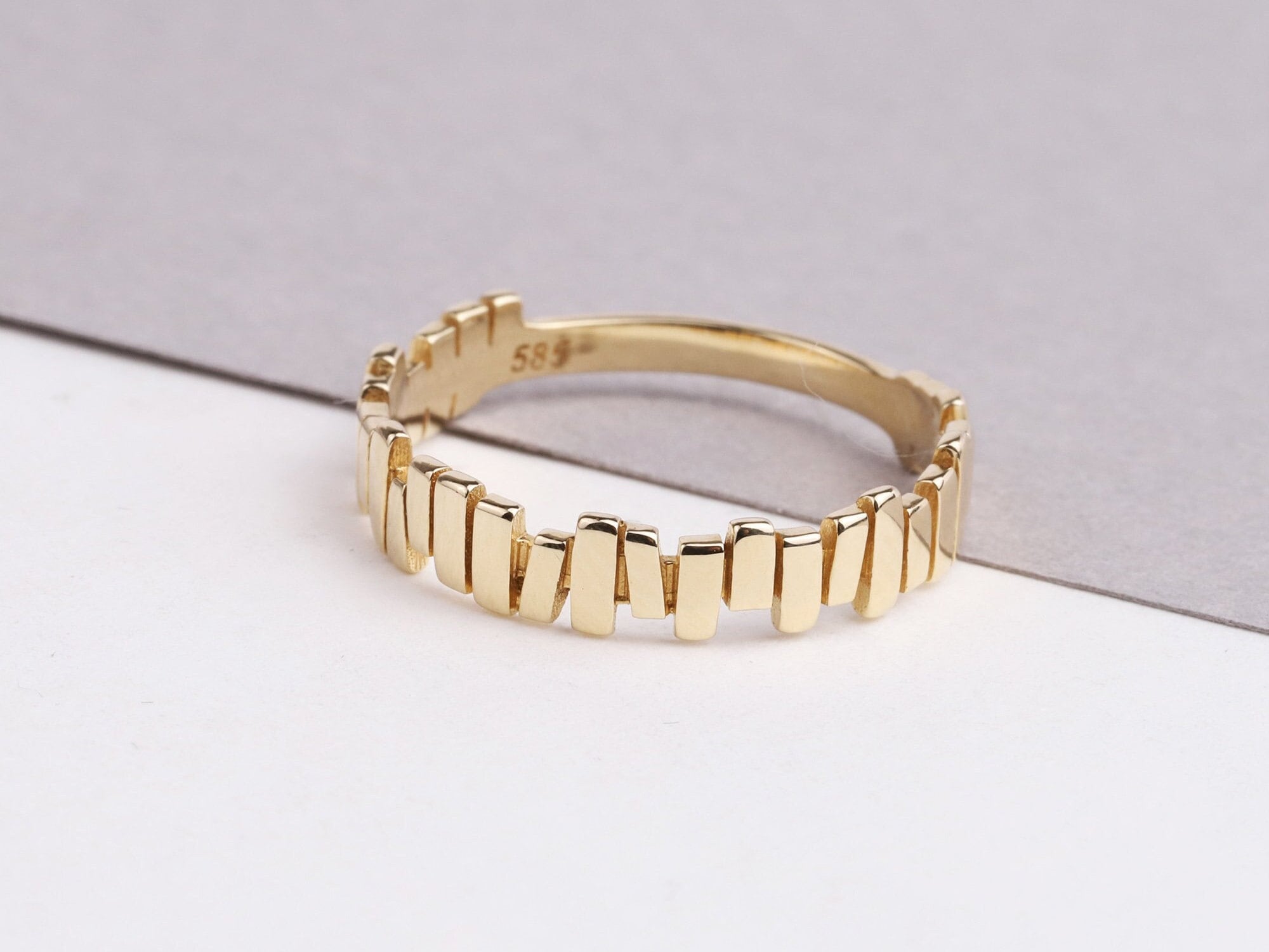 This 14K solid gold zigzag ring is a unique and stylish piece of jewelry that would make a great gift for any occasion. The ring features a minimalist design with tiny sticks arranged in a zigzag pattern, creating a statement piece that is sure to turn heads. The ring is made of real gold, ensuring that it is of high quality and will last for years to come. It is a perfect choice for anyone who loves minimalist and unique jewelry. This ring would make a thoughtful gift for a friend or loved one, whether it be for a special occasion like Christmas, Father's Day, Mother's Day, Valentine's Day, an anniversary, or a birthday. It comes in a beautiful gift box, making it ready to give as a present.