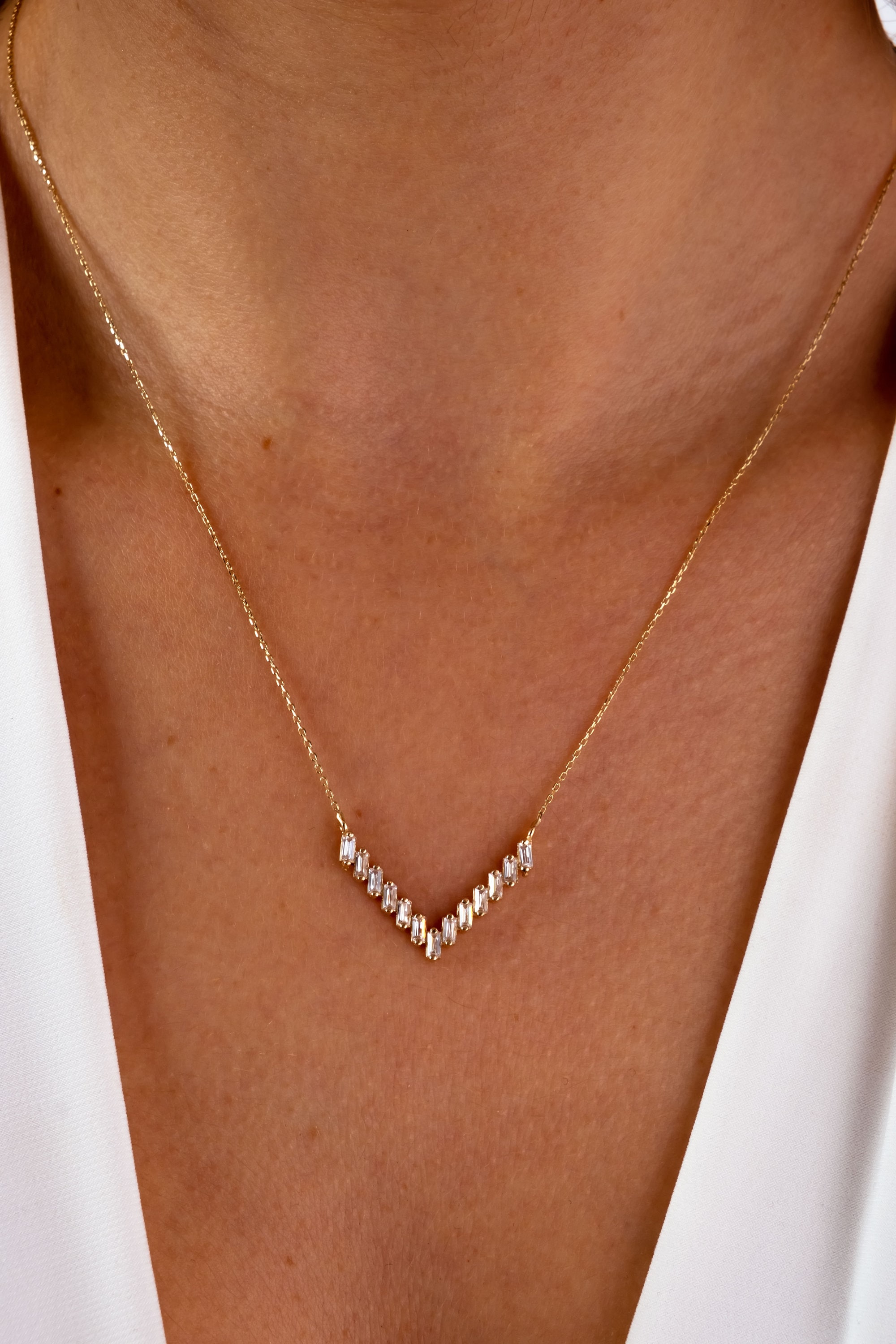 This 14K gold V-shaped necklace is a stunning and elegant piece of jewelry that would make a beautiful gift for any occasion. The CZ diamond chevron pendant is a unique and stylish design, featuring a minimalist geometric V-shaped charm that is encrusted with sparkling diamonds. This necklace would be a perfect gift for a loved one on Christmas, Father's Day, Mother's Day, Valentine's Day, an anniversary, or a birthday. It is also a great choice as a wedding necklace, as its sophisticated and timeless design would complement any bridal ensemble. The necklace hangs from a delicate chain and would sit close to the neck, making it perfect for layering with other necklaces or wearing on its own. It would make a lovely addition to any jewelry collection and is sure to be appreciated by the recipient.
