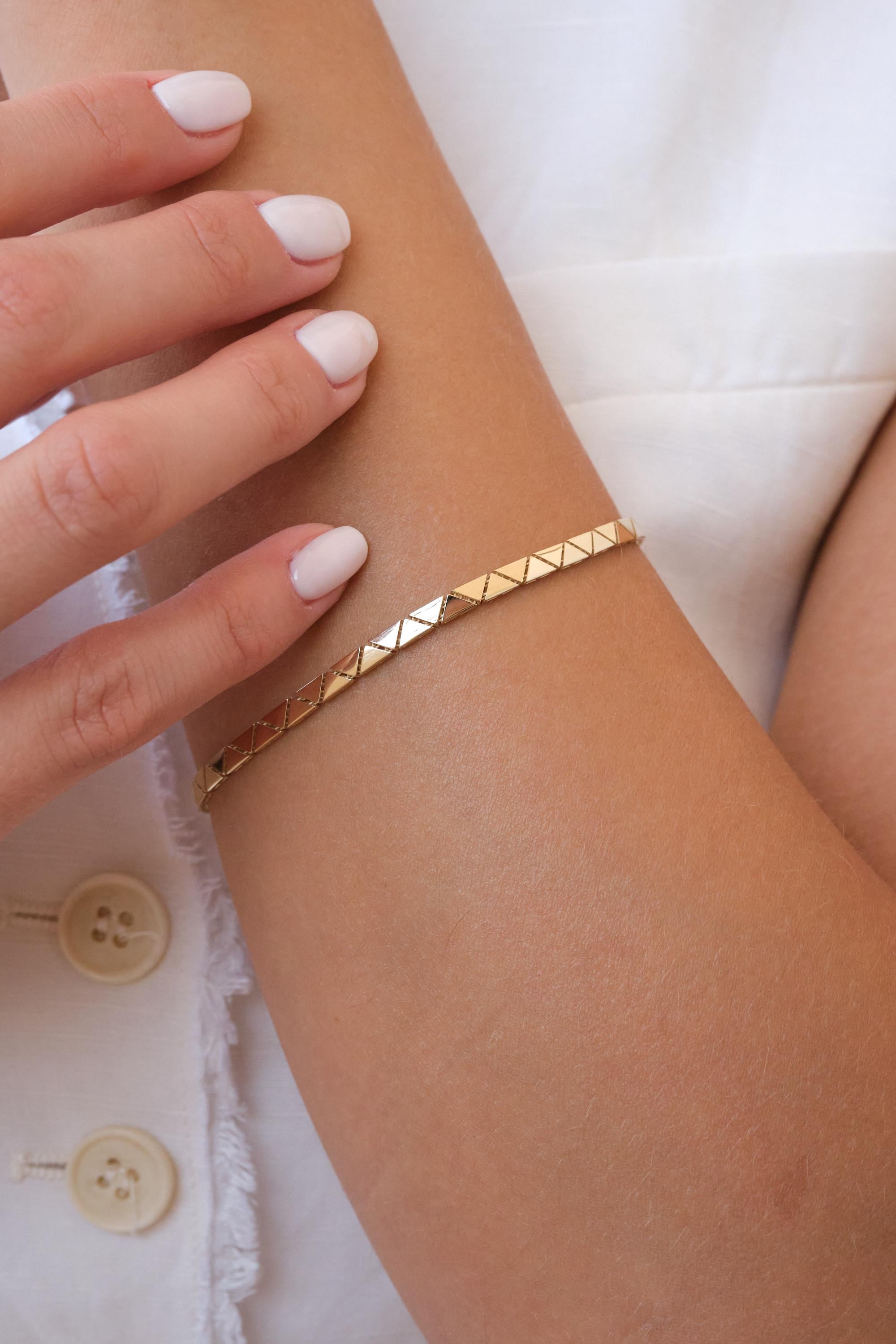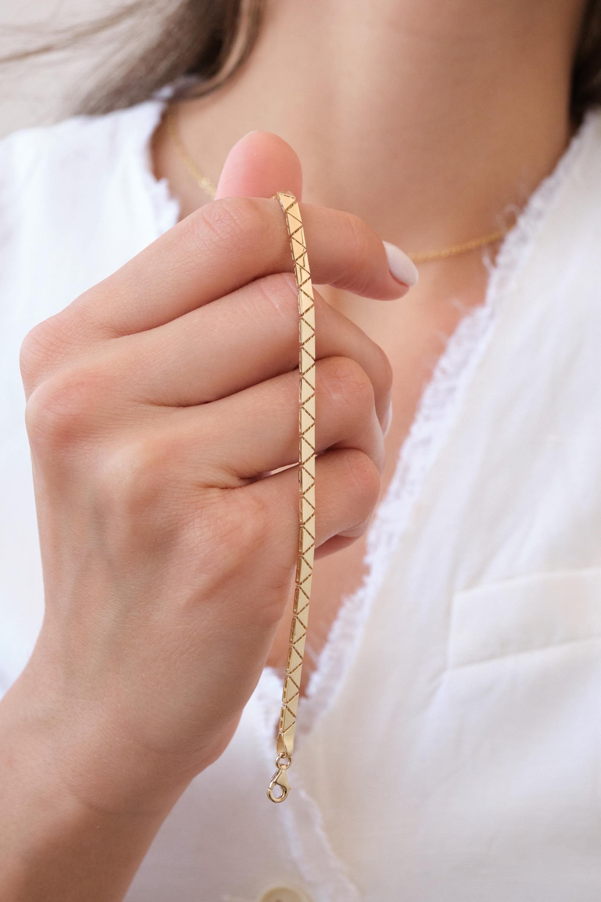 We manufacture our jewelry pieces with carefully and after production we double checking in quality control department. Our main idea is keep our items for daily wearing especially for minimalist jewelry pieces. 14K Gold Chevron Link Bracelet, 3mm Geometric Triangle Gold Bracelet, Faceted Pyramid Link Bracelet, Modern Gold Jewelry, Gift for Her, Christmas, New Year, Mothers Day, Valentines Day, Anniversary, Birthday Gift, Fathers Day